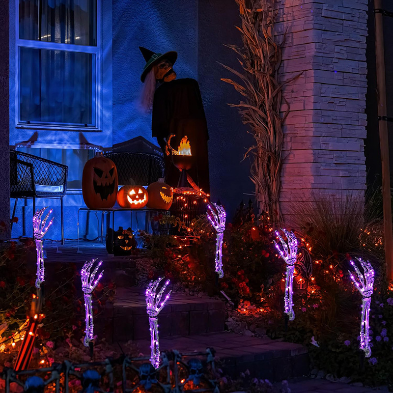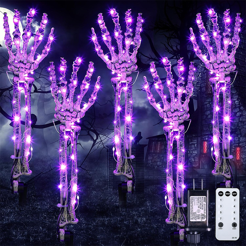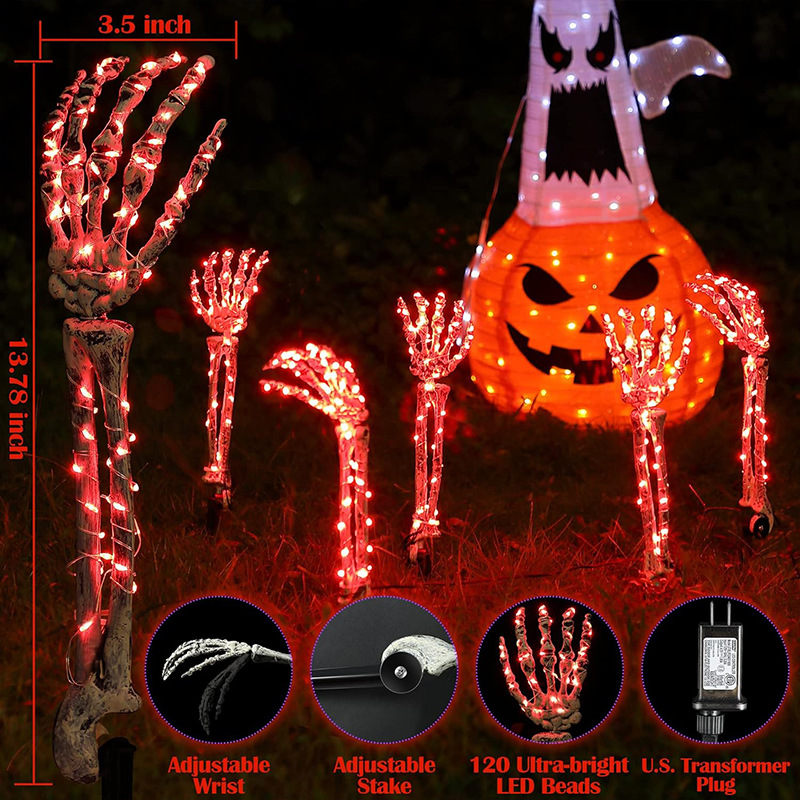 Get ready to spook up your porch and yard with these Ghost Hand Props! This set includes 5 hands with stakes, an LED light string, and a remote control. Perfect for those chilly fall nights, these waterproof hands will add an eerie glow to your Halloween decorations.